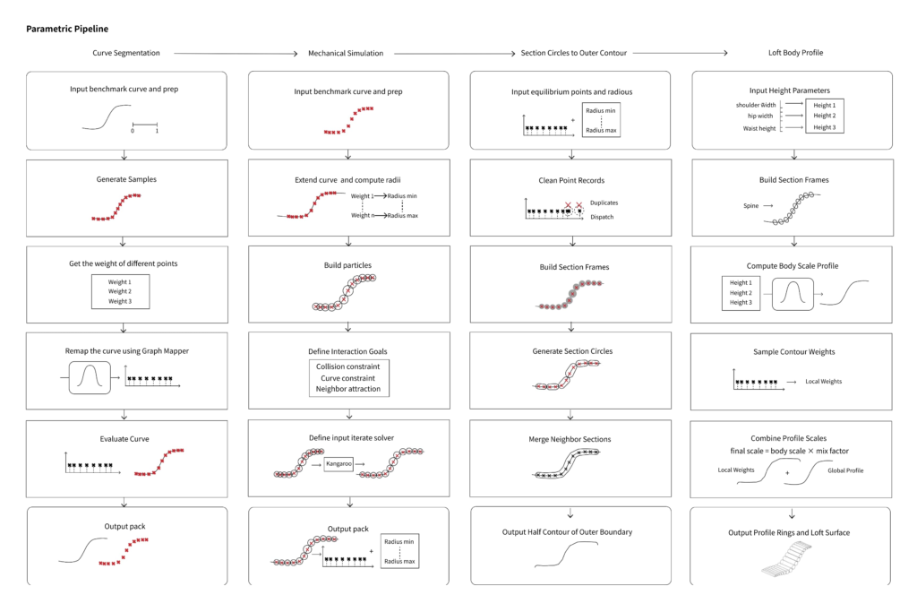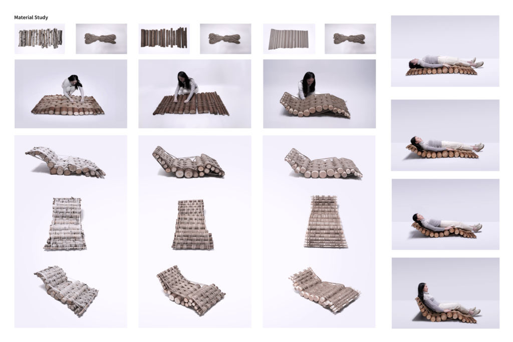 Human spinal curvature varies across individuals and postures, creating different support needs along the back and pelvis. Responding to this fact, this project develops a fabrication-driven chair that can adapt its support profile from shoulder to hip. By quantifying spine alignment with ergonomic curvature metrics and translating them into a parametric workflow—curve segmentation, radius-driven mechanical simulation, contour extraction, and profile lofting—the system generates a continuous body-matched surface rather than a fixed, generic backrest. The resulting geometry is then discretized into repeatable components and assembled through a wood-and-weave construction logic, enabling rapid prototyping and material testing. Through iterative fabrication and full-body trials in multiple lounging positions, the project demonstrates how ergonomic data can directly inform a buildable chair system, bridging measurable posture differences and hands-on making.