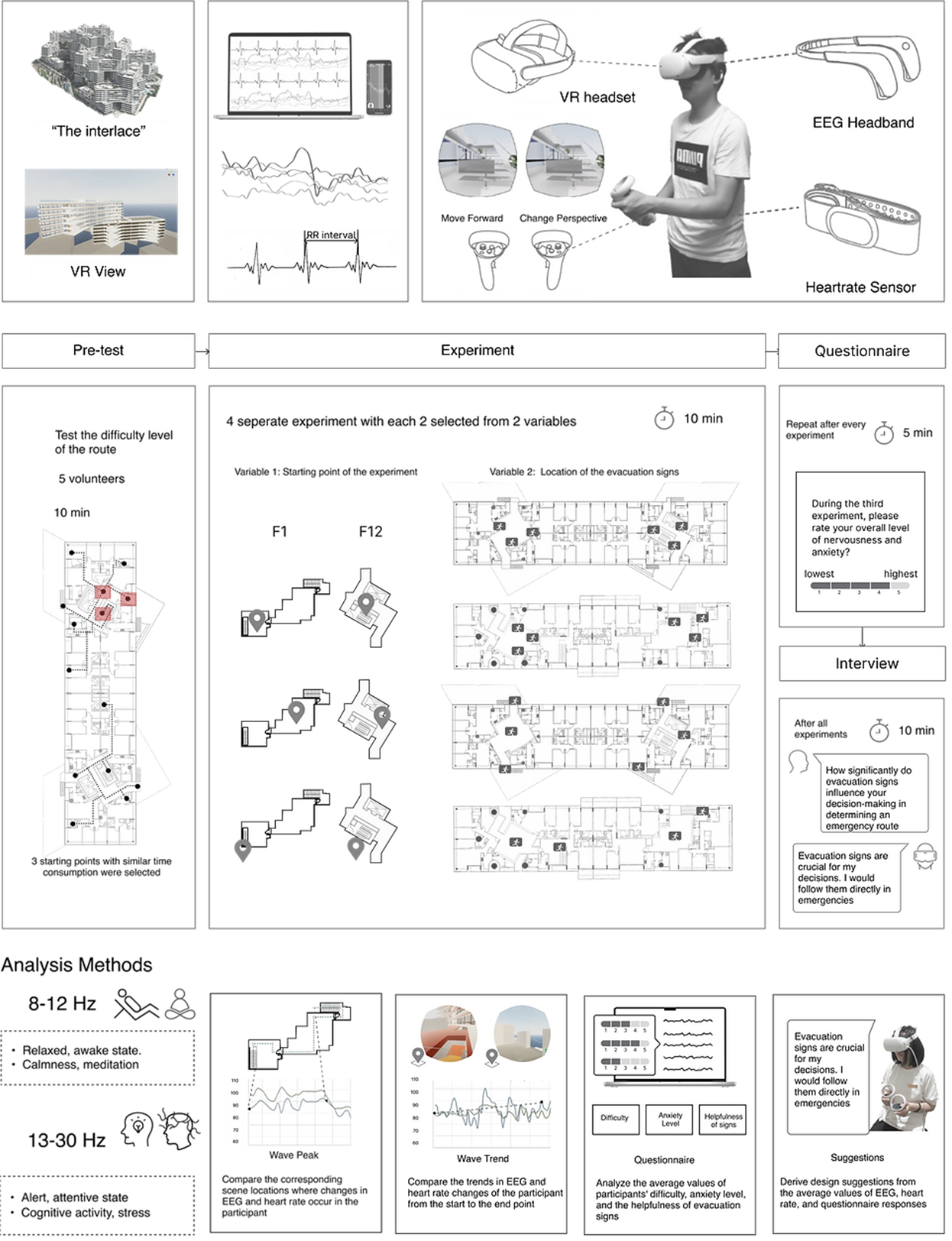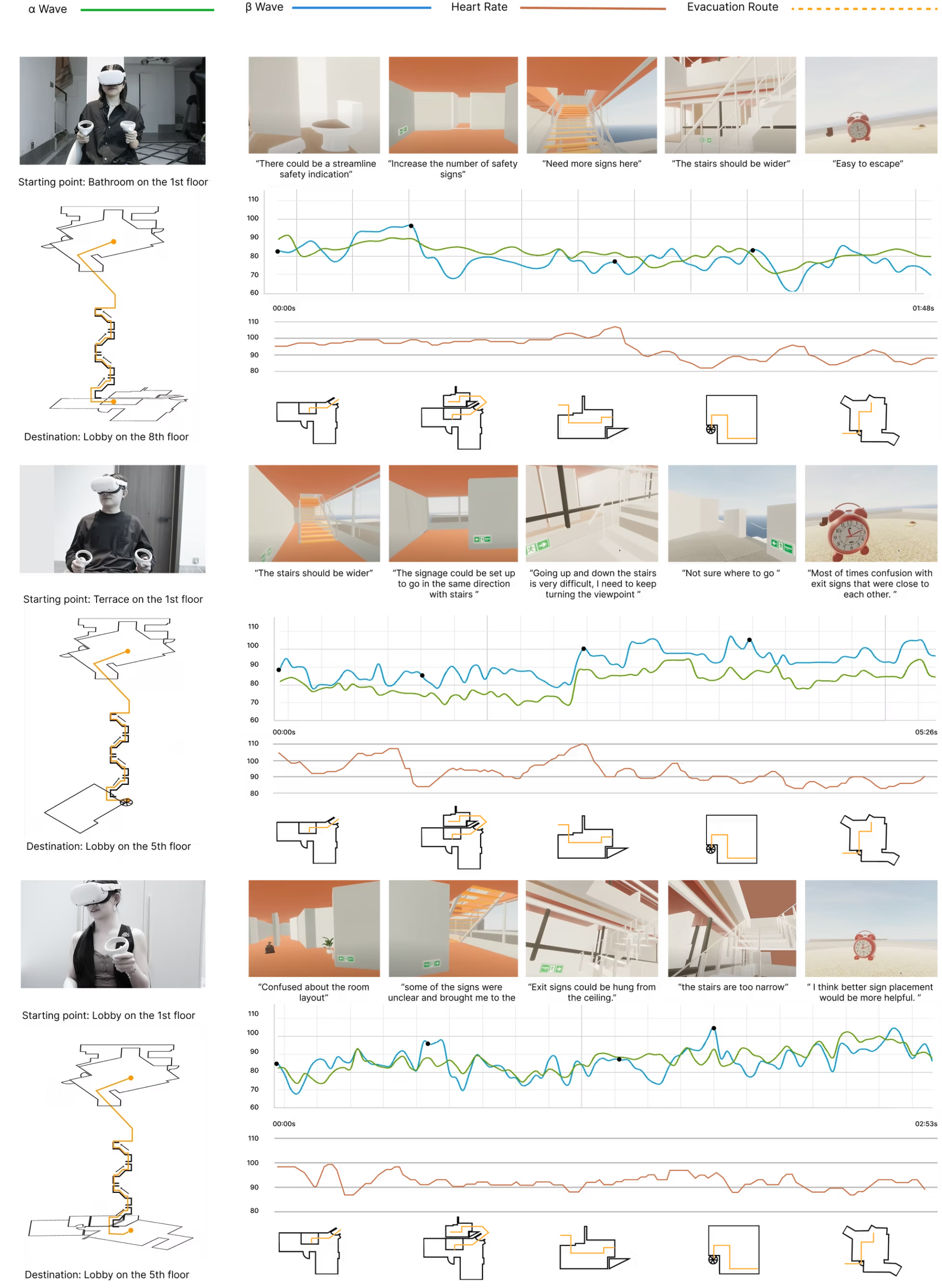 Emergency evacuation is a critical aspect of disaster management, especially within complex architectural structures. Research indicates that individuals’ emotional states significantly impact theirdecision-making and evacuation efficiency during emergencies. To examine the impact of safetysignage and the location of escape starting points on evacuees’ emotions and decision-making, this study utilized two blocks of The Interlace as case studies to create a virtual reality (VR) escapescenario.Participants underwent escape trials in a VR environment, during which electroencephalo-gram (EEG) and heart rate data were collected. Additionally, a questionnaire was administered togather information on their emotions and escape decision-making. The findings offer valuable guid-ance for the design of safety signage.