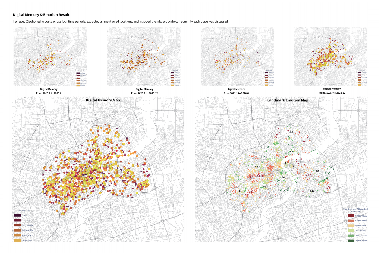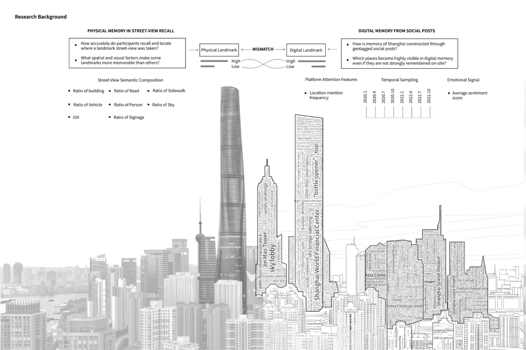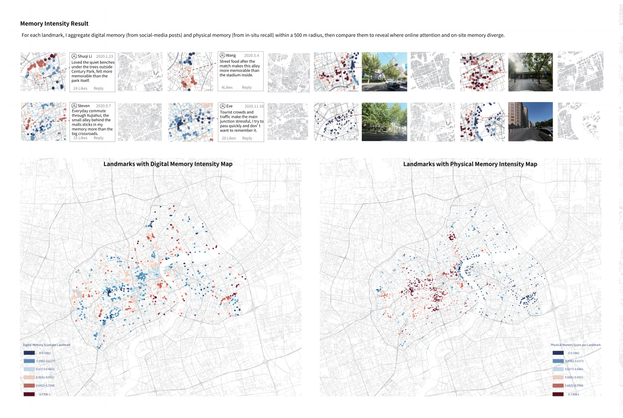 This project investigates how people remember the city differently in physical space and in digital media. First, a large-scale street-view experiment is used to measure physical memory: participants locate images on a map, generating a continuous memory score for each street segment. In parallel, digital memory is extracted from social-media posts, where natural-language processing and POI classification identify places that are frequently mentioned as landmarks. By mapping both layers onto Kevin Lynch’s landmark framework and aggregating them within 500–1000 m neighborhoods, the project reveals where strong everyday landmarks coincide with online hotspots and where they diverge. Areas with high digital but low physical memory expose “internet landmarks” that exist mainly on screens, while the opposite pattern highlights locally familiar yet globally invisible places. Through grids, density maps and mismatch diagrams, Overlaid Memories rethinks how urban design should respond to both lived cognition and platform-driven visibility in contemporary Shanghai.