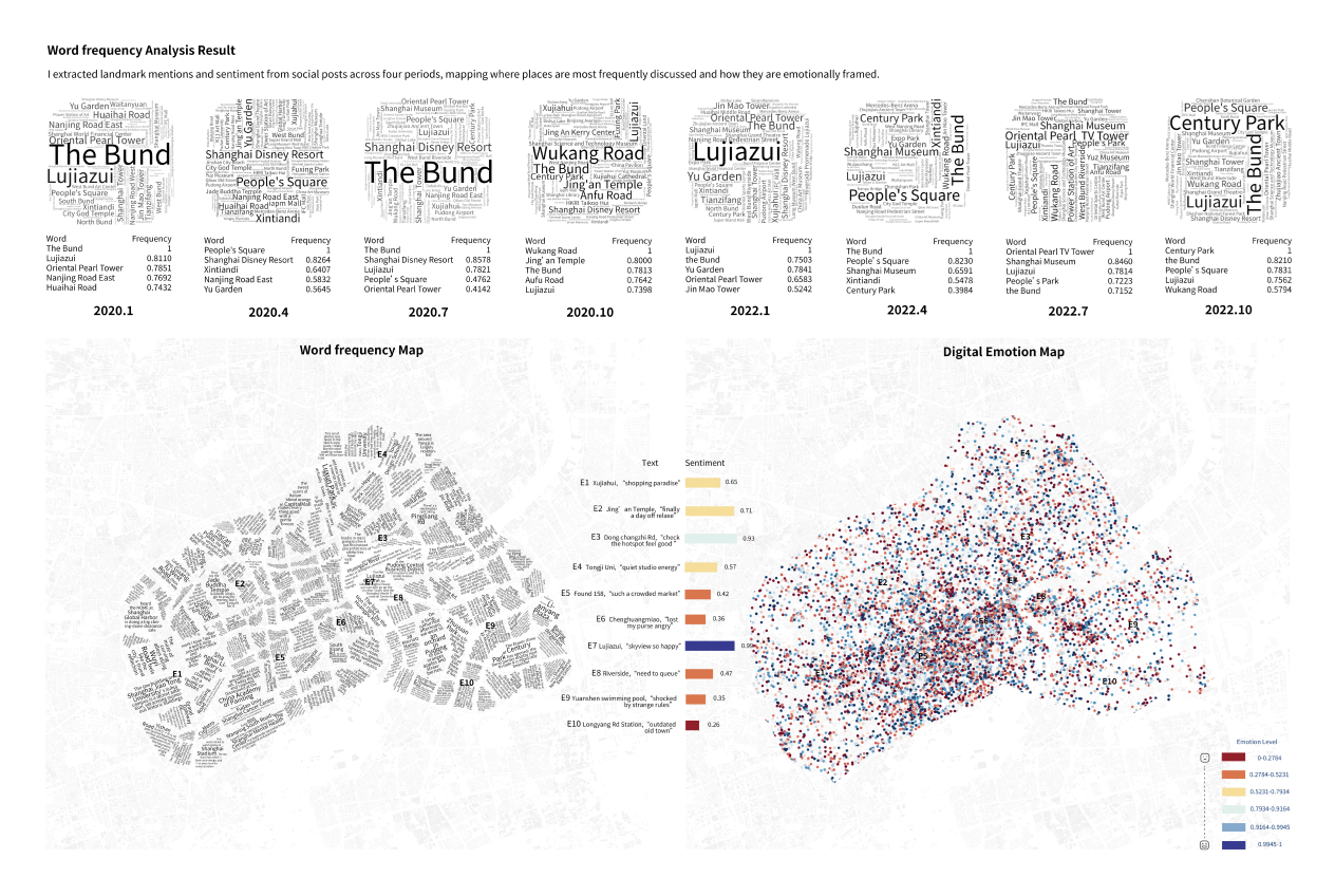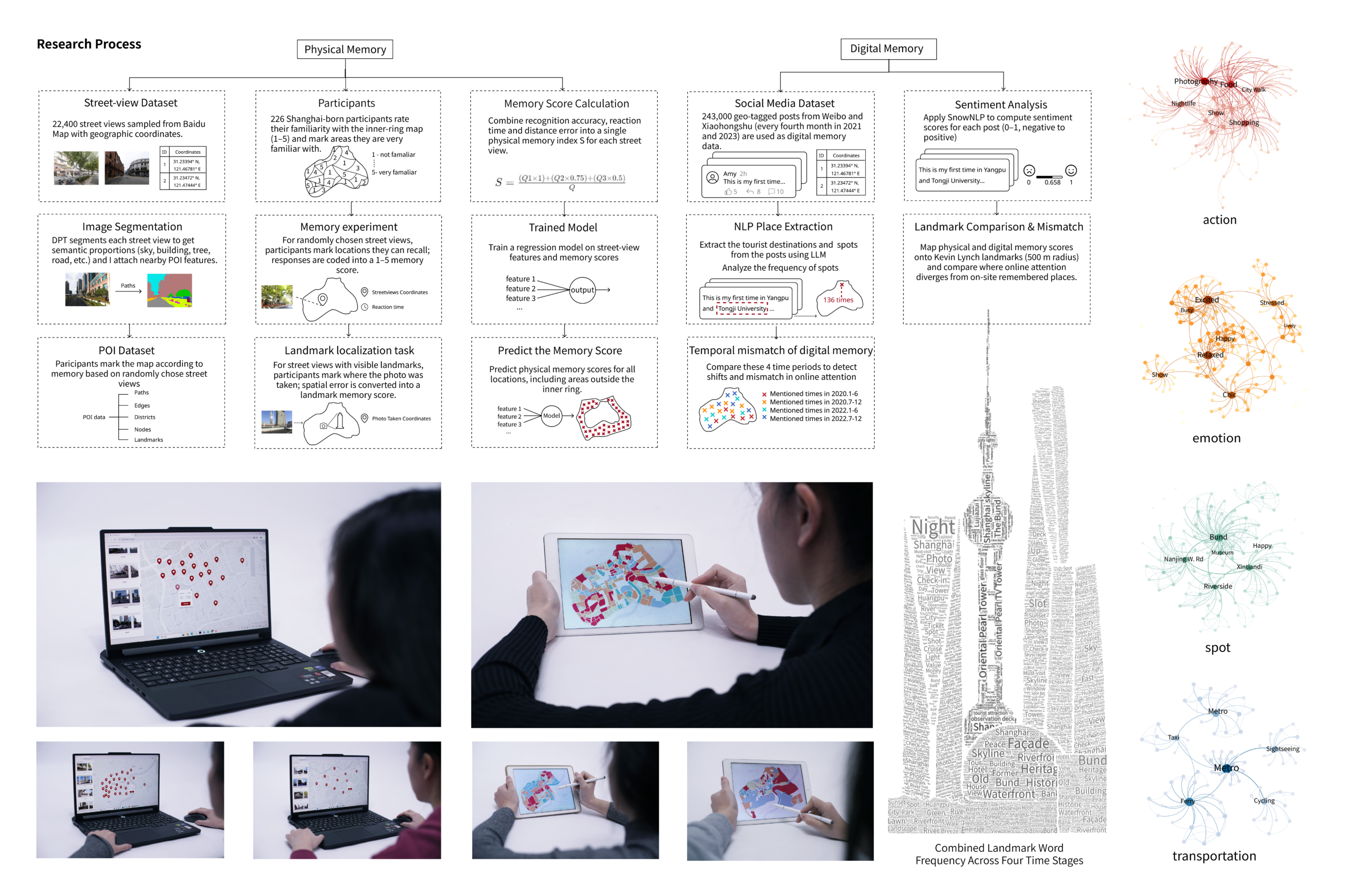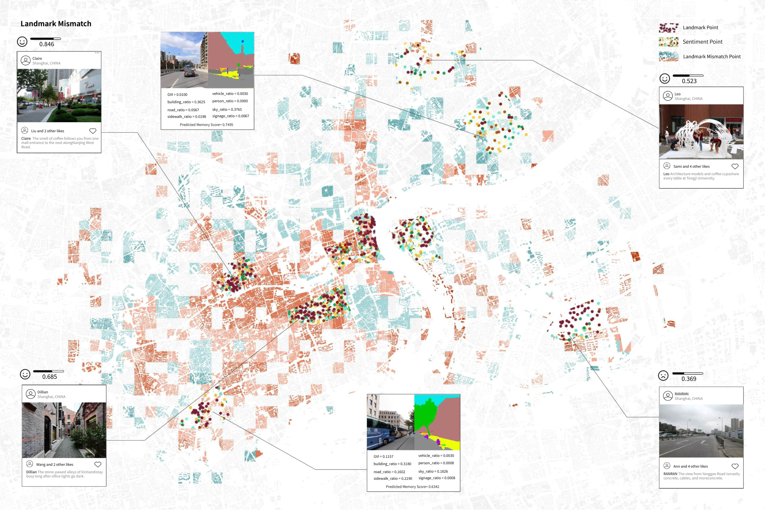 This project investigates how people remember the city differently in physical space and in digital media. First, a large-scale street-view experiment is used to measure physical memory: participants locate images on a map, generating a continuous memory score for each street segment. In parallel, digital memory is extracted from social-media posts, where natural-language processing and POI classification identify places that are frequently mentioned as landmarks. By mapping both layers onto Kevin Lynch’s landmark framework and aggregating them within 500–1000 m neighborhoods, the project reveals where strong everyday landmarks coincide with online hotspots and where they diverge. Areas with high digital but low physical memory expose “internet landmarks” that exist mainly on screens, while the opposite pattern highlights locally familiar yet globally invisible places. Through grids, density maps and mismatch diagrams, Overlaid Memories rethinks how urban design should respond to both lived cognition and platform-driven visibility in contemporary Shanghai.