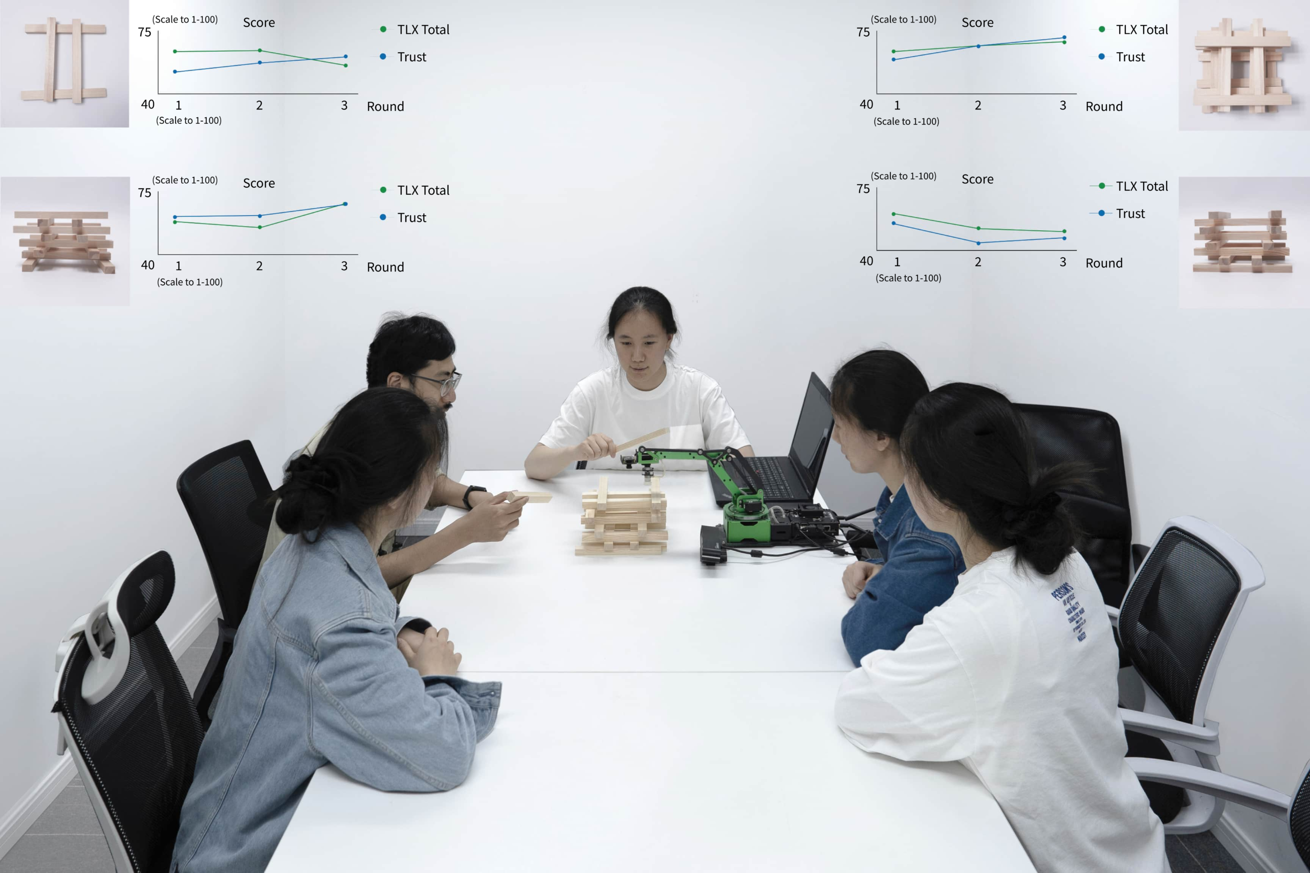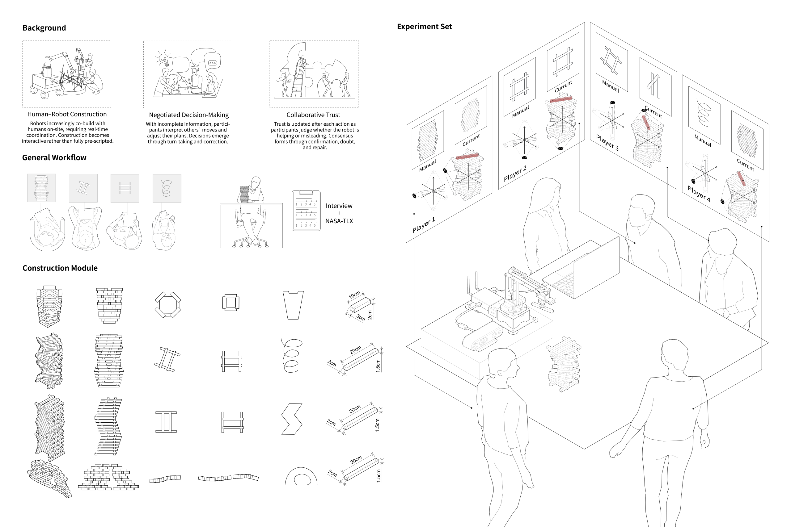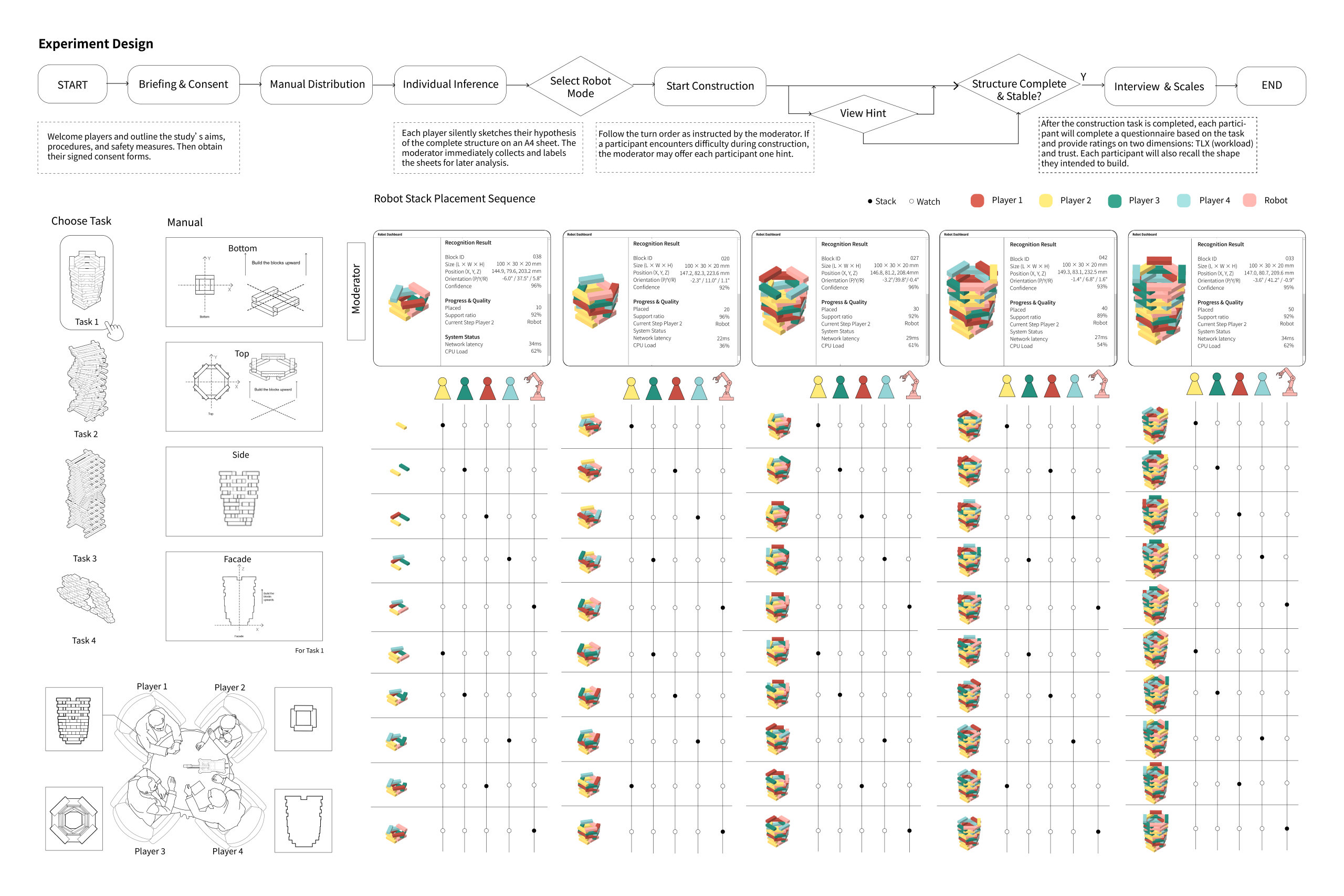 This project investigates how people form trust and shared understanding when co-creating with a robotic arm under incomplete information. Four participants play a turn-based construction game in which each person receives a manual containing only one face of the target structure, and must infer the full form from others’ placements and the robot’s actions. Technically, the system closes the loop from perception to execution: a vision pipeline detects the current block poses and tower state, a placement planner generates feasible candidates under support and collision constraints, and a similarity-based scoring function selects the next placement before transforming it into the robot coordinate frame for pick-and-place. Across trials, the robotic arm operates in two behavioral modes—Assist, which prioritizes placements that align with the intended geometry, and Distract, which introduces plausible yet misleading placements while remaining physically feasible. After the game, semi-structured interviews, NASA-TLX, and a memory-based reconstruction task capture how participants’ hypotheses evolve into negotiated strategies and final imagined designs. By framing collaboration as an iterative cycle of judgment, correction, and consensus-building, the project highlights how robots can reshape perception, trust, and cooperative design behavior.