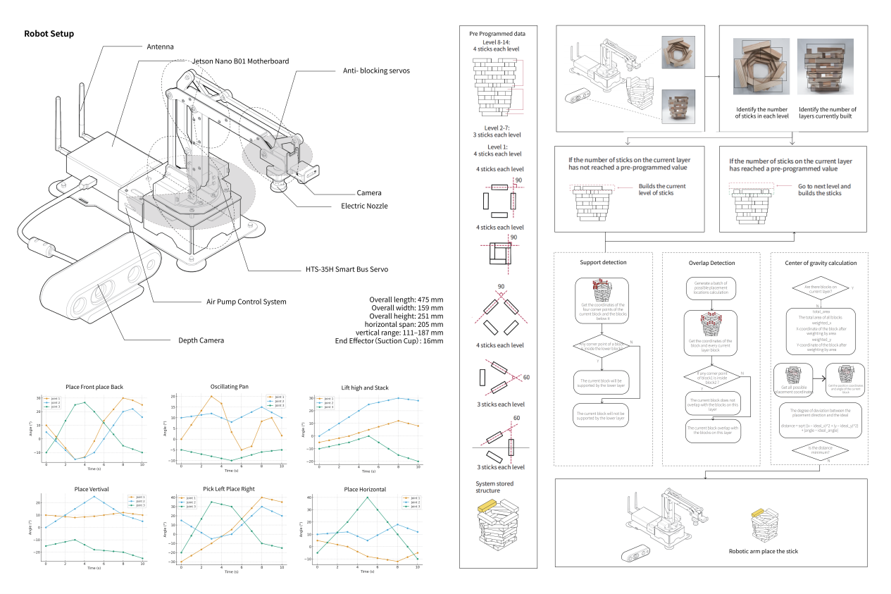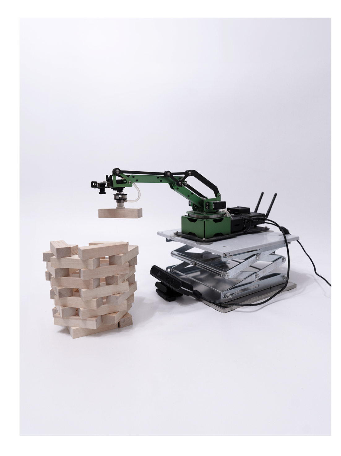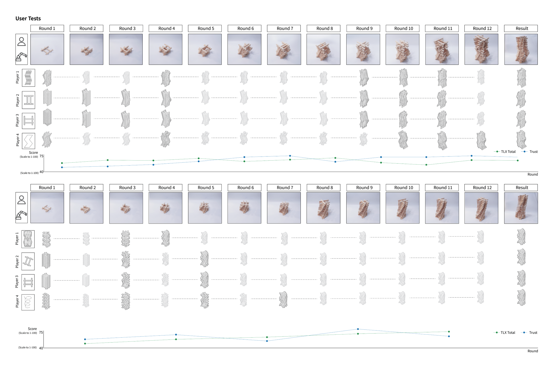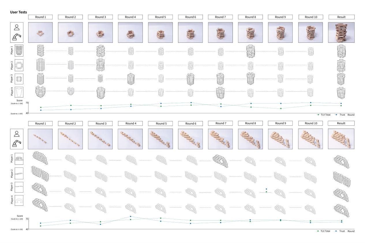 This project investigates how people form trust and shared understanding when co-creating with a robotic arm under incomplete information. Four participants play a turn-based construction game in which each person receives a manual containing only one face of the target structure, and must infer the full form from others’ placements and the robot’s actions. Technically, the system closes the loop from perception to execution: a vision pipeline detects the current block poses and tower state, a placement planner generates feasible candidates under support and collision constraints, and a similarity-based scoring function selects the next placement before transforming it into the robot coordinate frame for pick-and-place. Across trials, the robotic arm operates in two behavioral modes—Assist, which prioritizes placements that align with the intended geometry, and Distract, which introduces plausible yet misleading placements while remaining physically feasible. After the game, semi-structured interviews, NASA-TLX, and a memory-based reconstruction task capture how participants’ hypotheses evolve into negotiated strategies and final imagined designs. By framing collaboration as an iterative cycle of judgment, correction, and consensus-building, the project highlights how robots can reshape perception, trust, and cooperative design behavior.